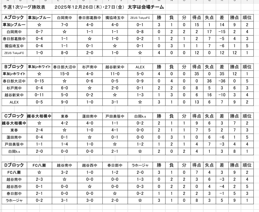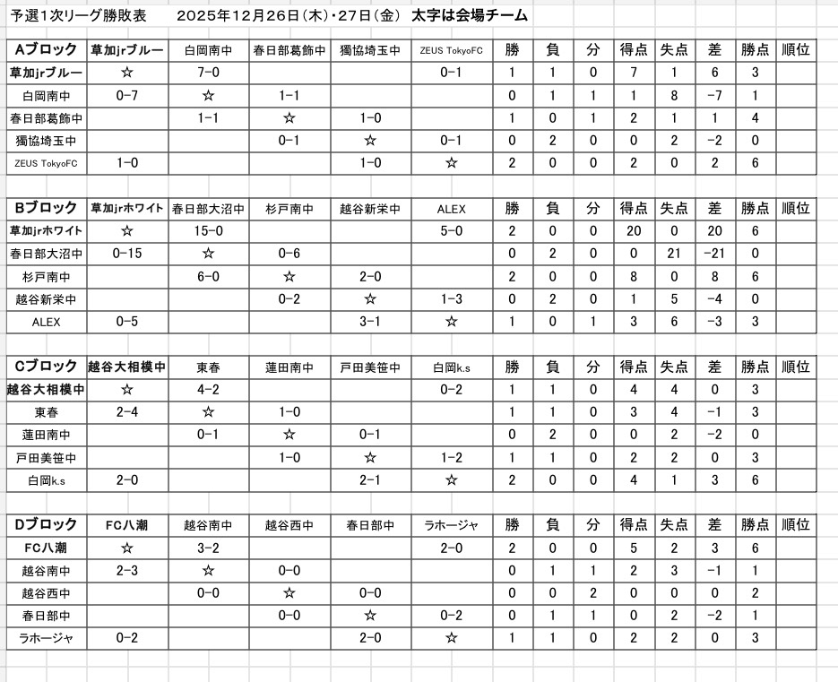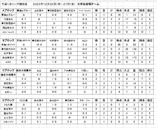 2025.12.26 【U-14】2025ダイヤモンドカップ1日目対戦成績